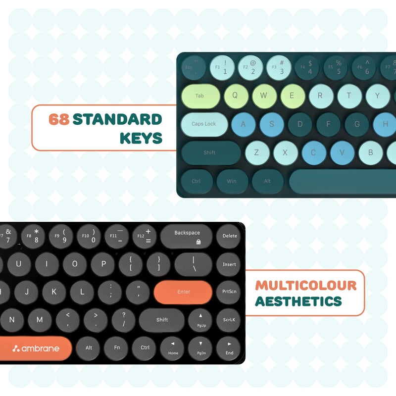 Explore the typing convenience with KeyPop's 68 standard keys and vibrant multicolour aesthetics, offering a complete and visually appealing typing solution.